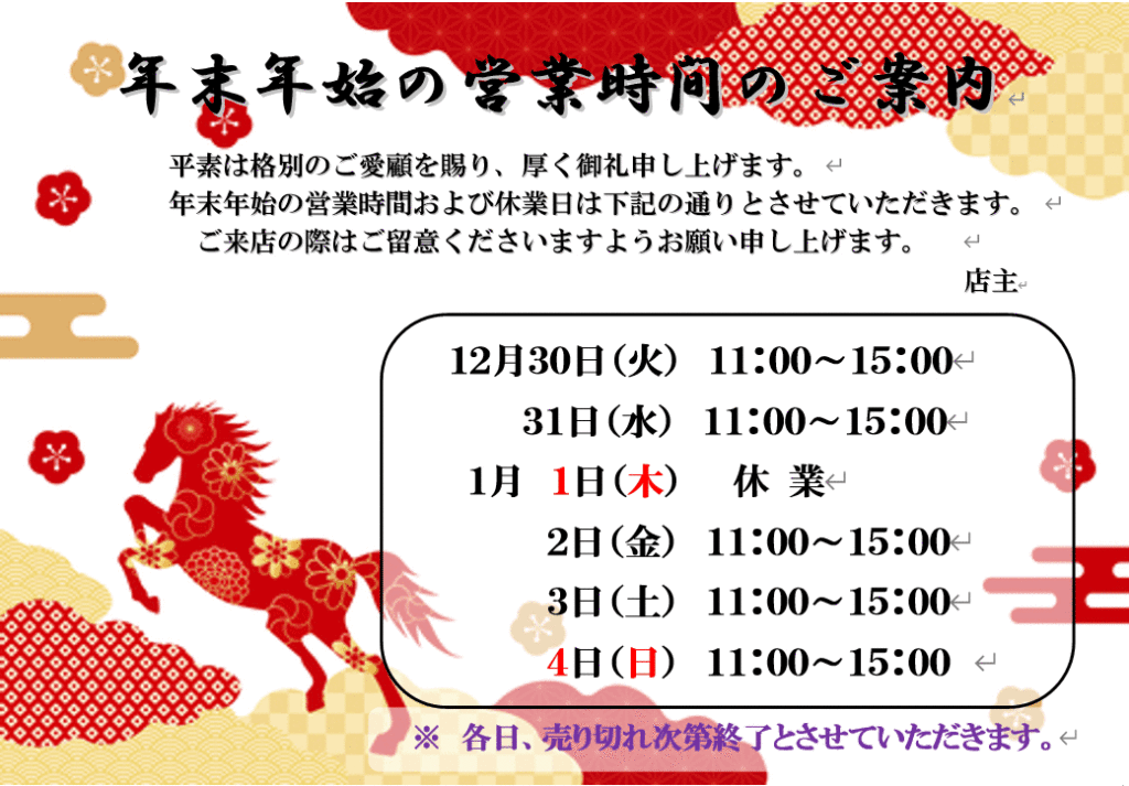 お知らせ2025年12月29日年末年始の営業のお知らせ
